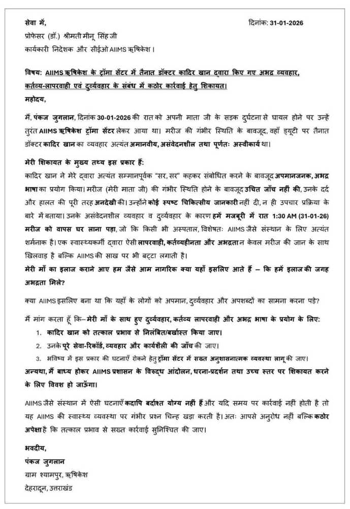 पीड़ित के पुत्र पंकज जुगलान के अनुसार, 30 जनवरी की रात सड़क दुर्घटना में गंभीर रूप से घायल उनकी माता को तत्काल AIIMS ऋषिकेश के ट्रॉमा सेंटर लाया गया था। आरोप है कि मरीज की हालत नाज़ुक होने के बावजूद ड्यूटी पर तैनात डॉक्टर ने न तो समुचित चिकित्सकीय जांच की और न ही उपचार की कोई स्पष्ट जानकारी दी। इससे भी अधिक चिंताजनक यह कि डॉक्टर द्वारा कथित रूप से अपमानजनक और असंवेदनशील भाषा का प्रयोग किया गया।
